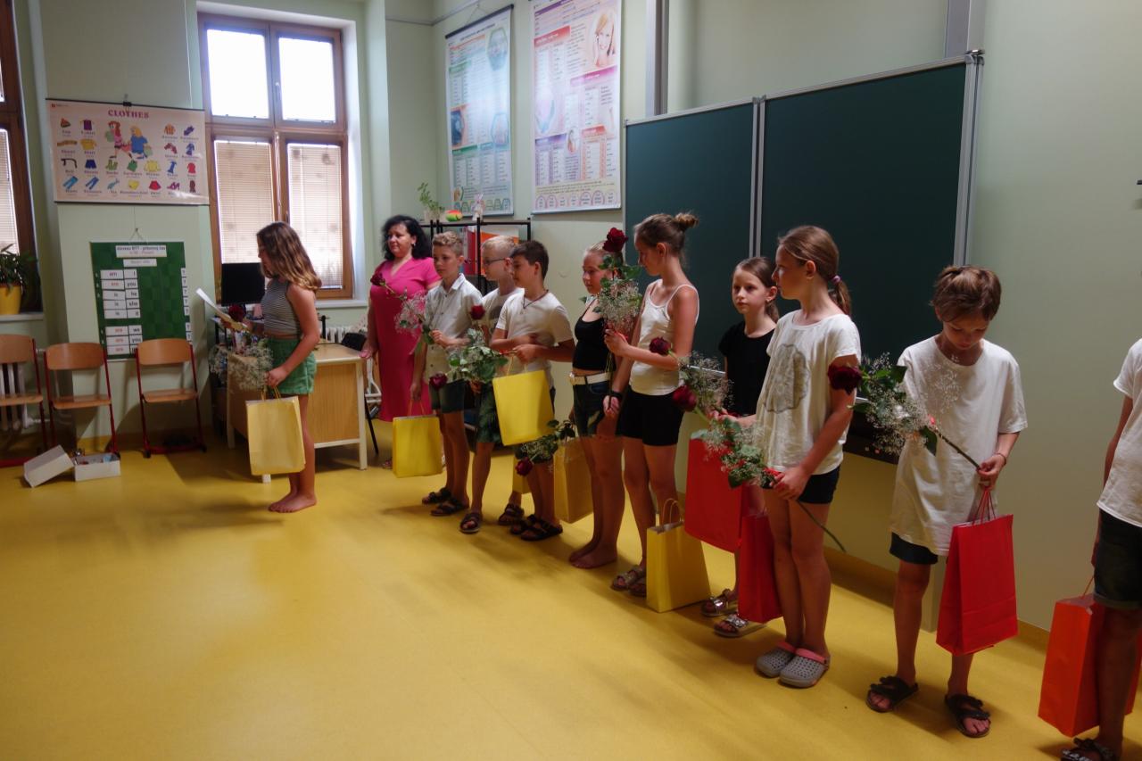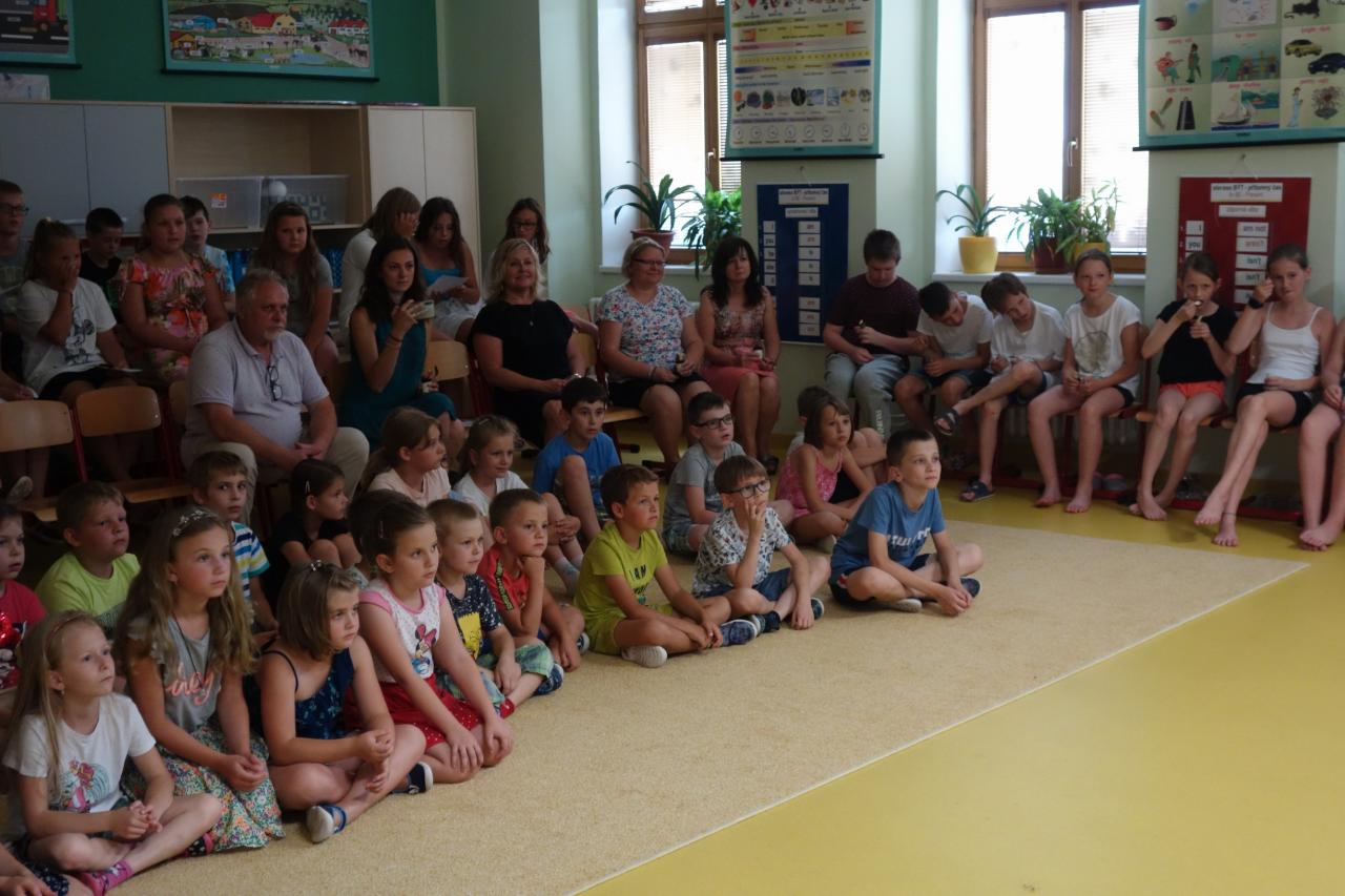 Ve své prezentaci „Jak šel čas“ zavzpomínali na celých pět let své školní docházky. Na učitele, školní výlety a další zážitky. Pak se představili ve svých medailoncích. Co mají rádi, po čem jim bude smutno, na co budou vzpomínat, kam po prázdninách půjdou do školy a čím by jednou chtěli být, jaké je jejich životní motto. Poté zatancovali rozlučkový tanec. Ostatní děti z nižších tříd pro ně připravili dárek v podobě miniopery Budulínek, autorské písničky, zábavné básně a žertovné písně. Pan starosta Mgr. Vít Tomaštík každému absolventovi naší školy předal kytičku a malý dárek, knižní i sladkou odměnu dostali i od třídní paní učitelky Mgr. Pavly Duchové. Páťáci byli jste bezva. Tak se mějte. Ředitelka školy Miroslava Klímová
