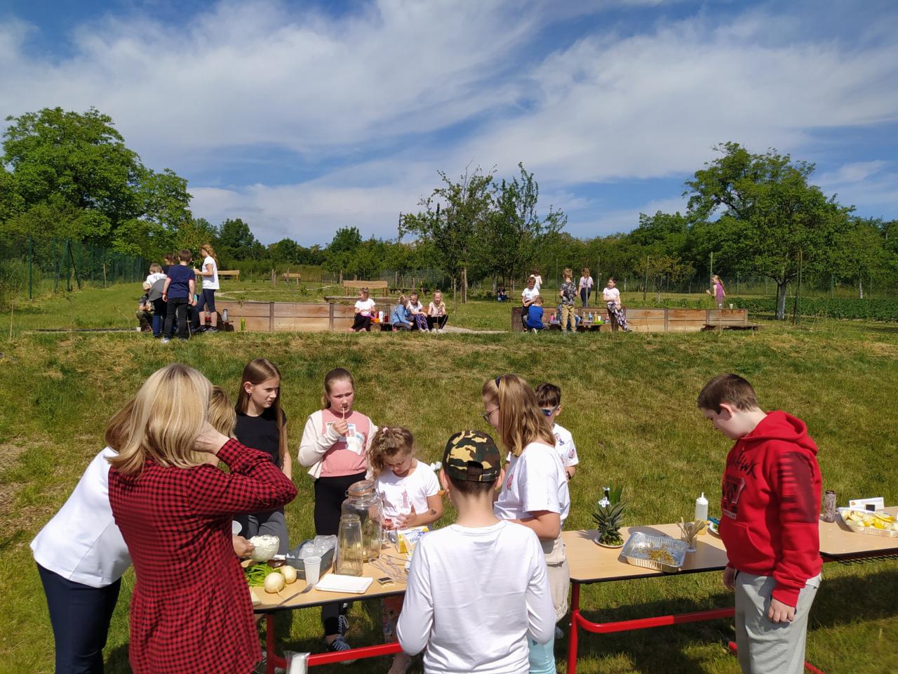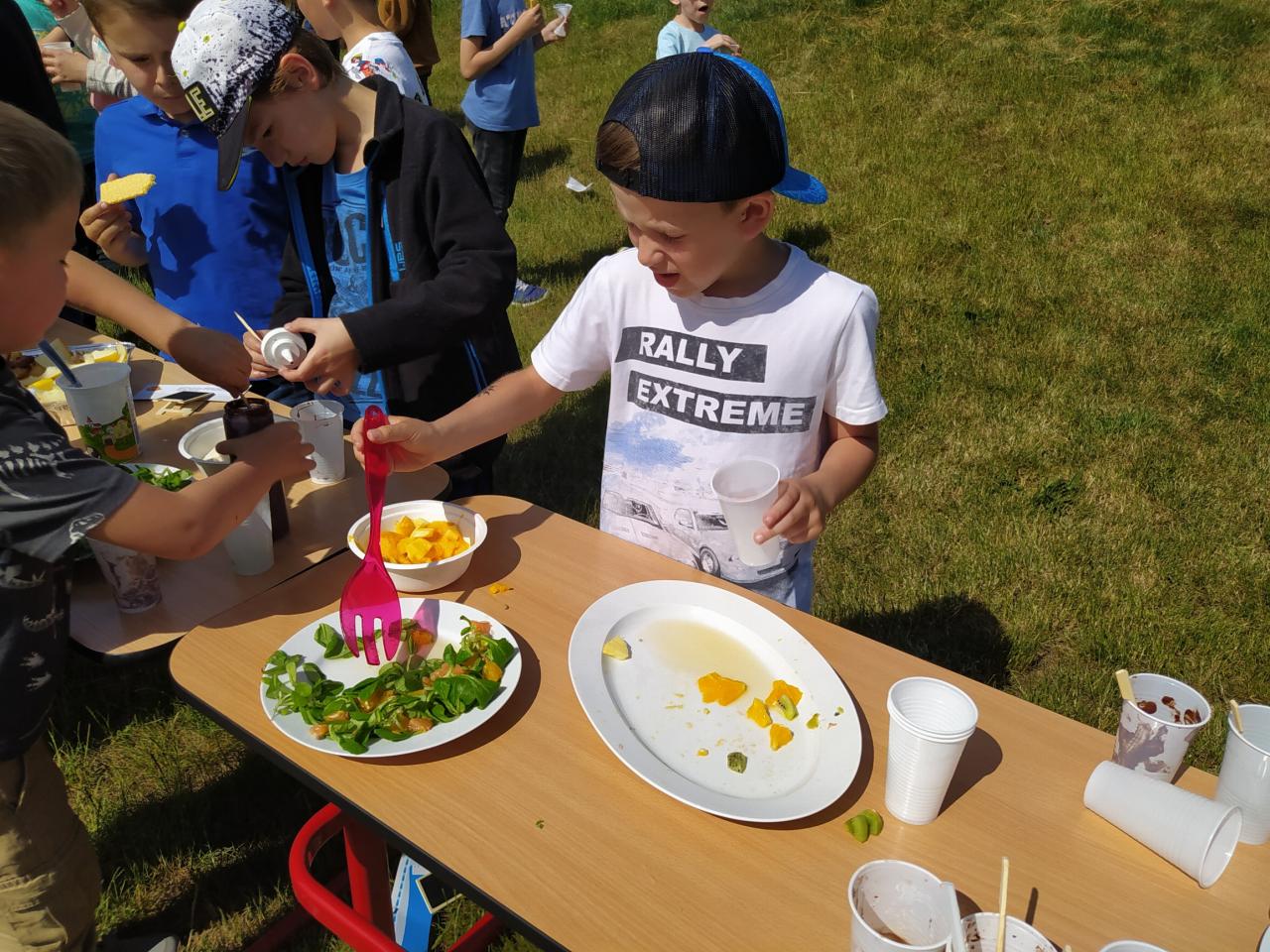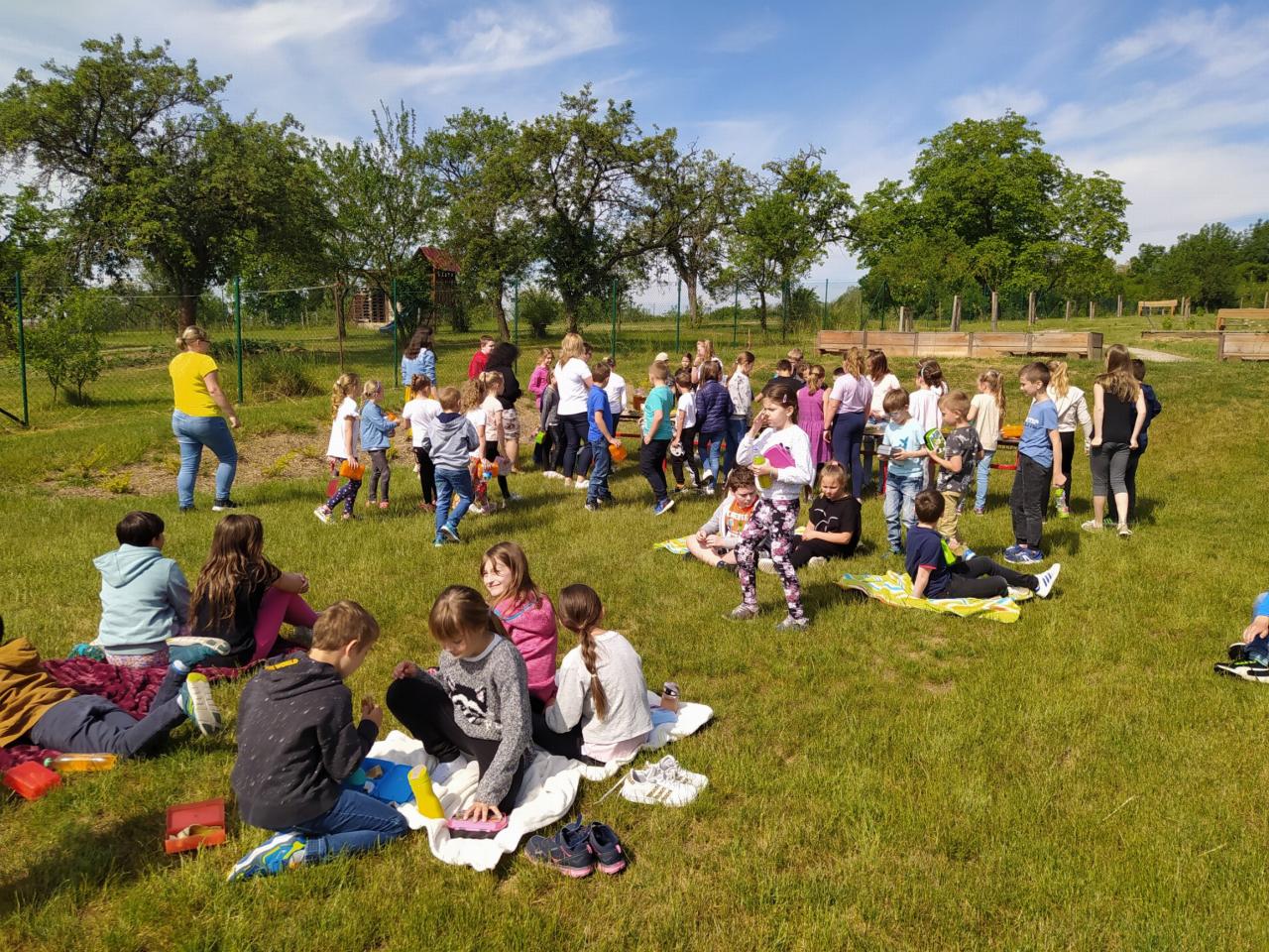 Díky projektu Ovoce do škol jsme mohli oslavit spolu oslavit Den dětí společnou svačinou na naší zahradě.